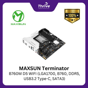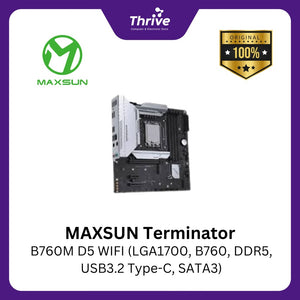 The MAXSUN Terminator B760M D5 WIFI is a Micro-ATX motherboard designed for Intel LGA1700 processors (12th & 13th Gen). Featuring the B760 chipset, it supports DDR5 memory, USB 3.2 Type-C, SATA3, and high-speed NVMe M.2 storage. With built-in WiFi & Bluetooth, it provides strong connectivity, making it an excellent choice for gaming and high-performance PC builds.