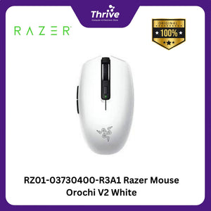 The **Razer Orochi V2 - White** (model **RZ01-03730400-R3A1**) is a compact, lightweight wireless gaming mouse designed for portability and precision. It features an **18,000 DPI Focus+ Optical Sensor** for accurate tracking. The mouse supports **HyperSpeed wireless technology**, ensuring ultra-low latency for smooth, responsive gameplay. Weighing just **60g**, it’s perfect for on-the-go gaming. The ergonomic design ensures comfort, making it an ideal choice for mobile gamers or those using laptops. Its sleek white color adds a stylish touch to your gaming setup.